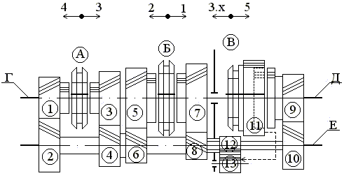 зубчатые муфты; Г- первичный вал; Д- вторичный вал; Е- промежуточный вал