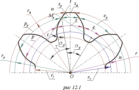 Изобразим схему зацепления эвольвентной зубчатой передачи (рис.12.12).